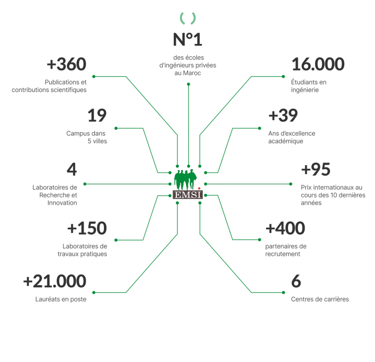 L’EMSI compte au total 19 sites dans le Royaume du Maroc (Casablanca, Rabat, Marrakech, Tanger et Fès). Chacun de ces sites compte de nombreuses salles de cours, laboratoires et centres de calcul dotés de matériels didactiques sophistiqués et de dernière génération pour les besoins des travaux pratiques, mini-projets, projets et recherche scientifique.